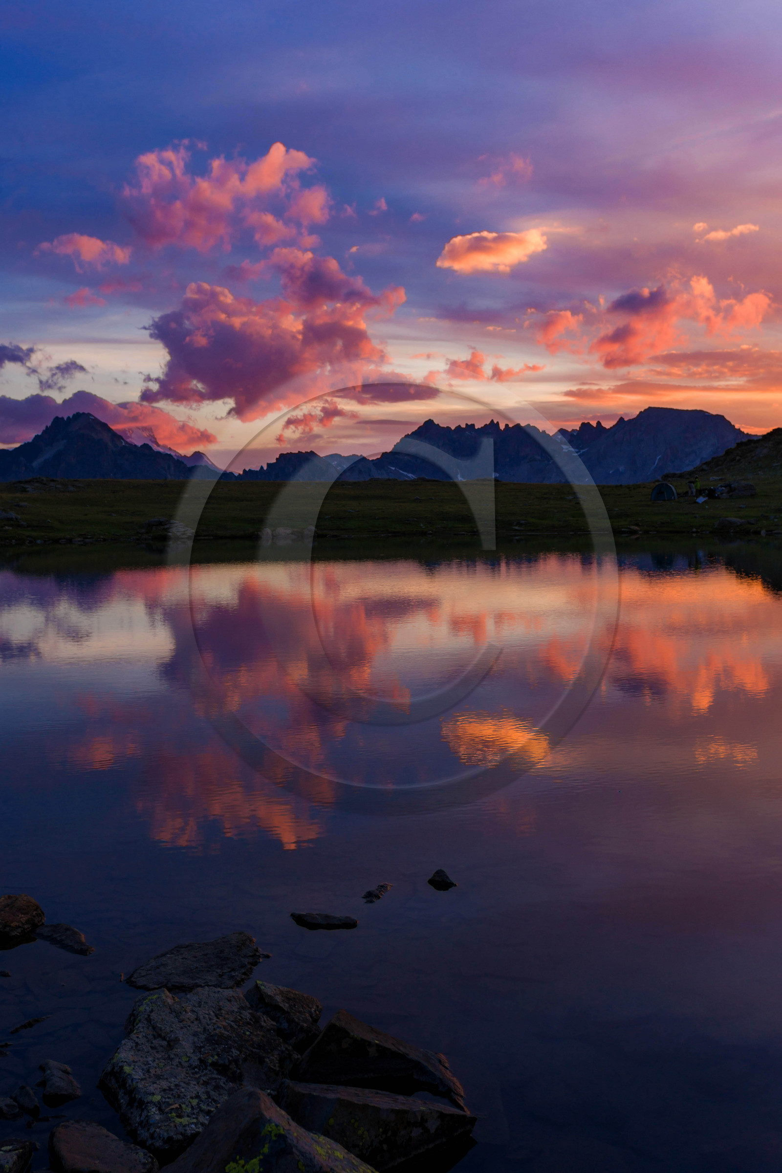 | Description | Hautes-Alpes (05), Briançonnais, Vallée de la Clarée, site naturel classé, Névache, crépuscule aux Lacs des Gardioles |
