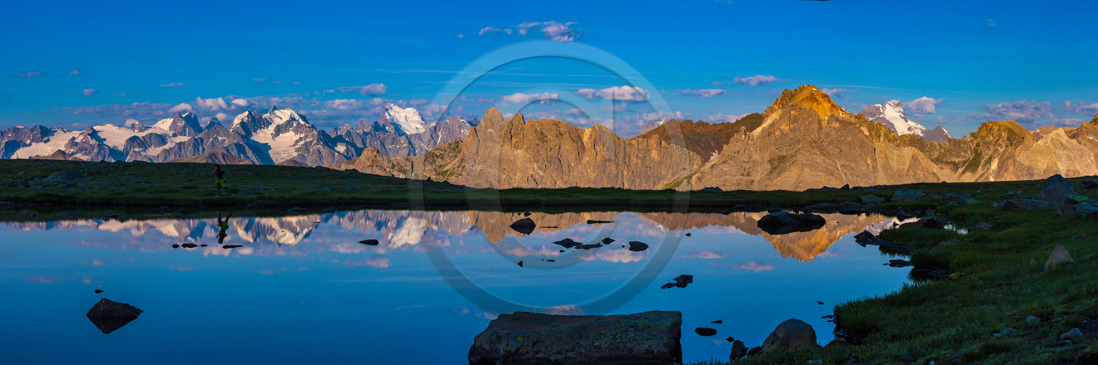| Description | Hautes-Alpes (05), Briançonnais, Vallée de la Clarée, site naturel classé, Névache, randonnée pédestre et lever de soleil aux Lacs des Gardioles, au fond, le massif des Ecrins, la Barre des Ecrins et la Meije |