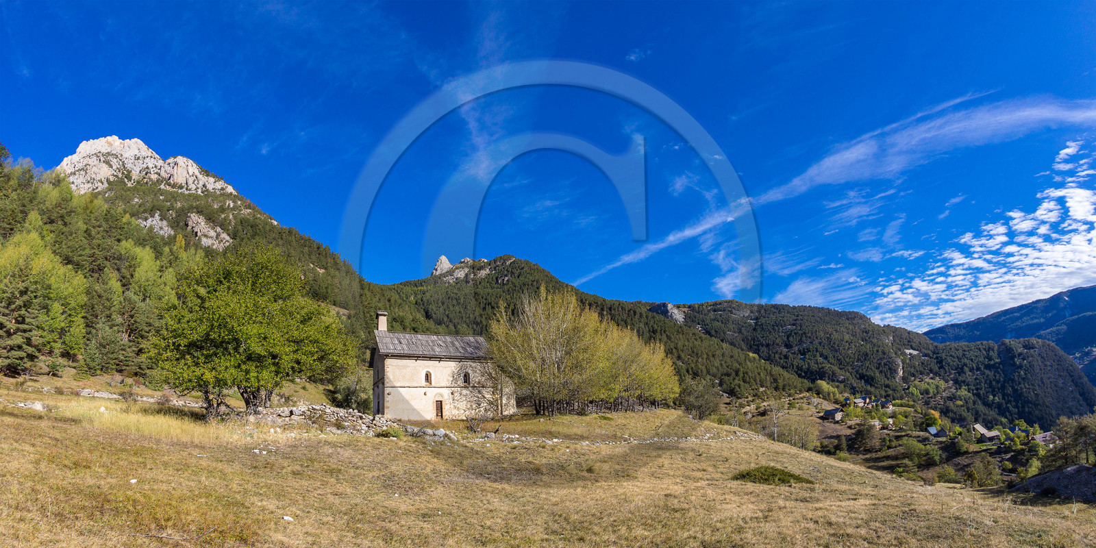 | Description | Hautes-Alpes (05), Parc naturel régional du Queyras, Arvieux, chapelle Sainte-Marie-Madeline-des-Escoyères et le hameau des Escoyères |