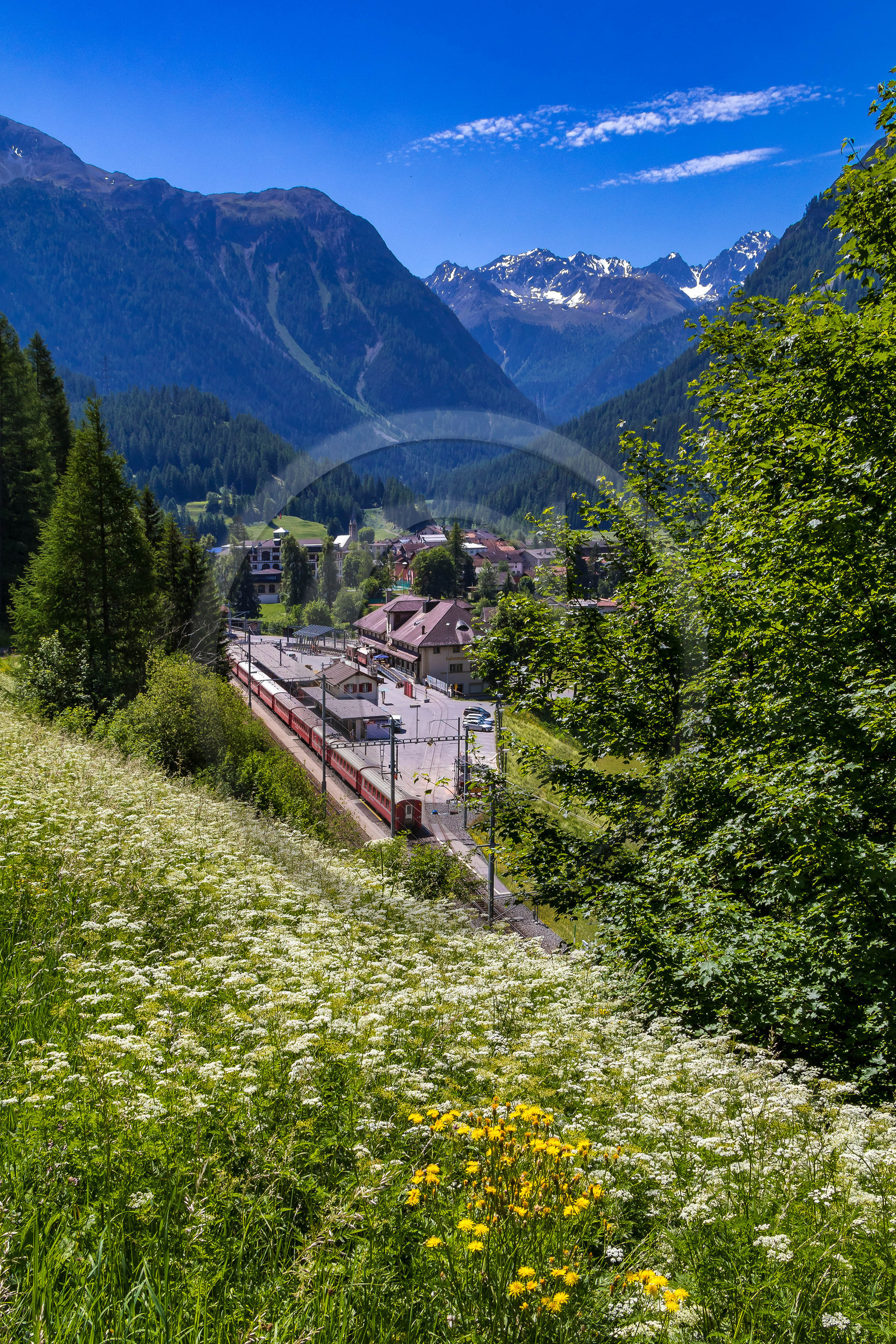 | Description | Switzerland, Canton of Graubünden, Rhaetian Railway, crossing the Alps on board the Bernina Express, UNESCO World Heritage Site, Bergün |
