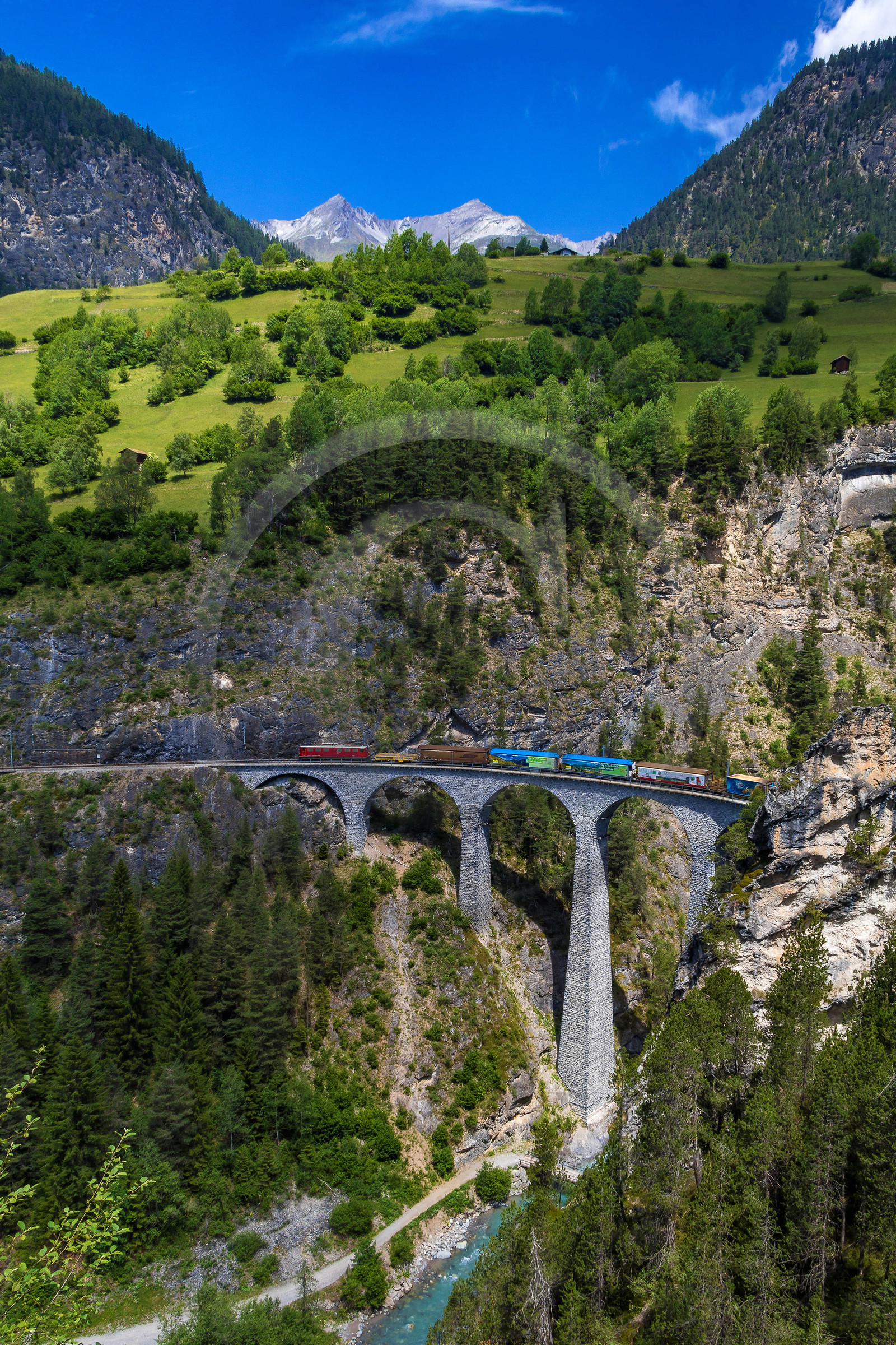 | Description | Suisse, canton des Grisons, Chemins de fer rhétiques, traversée des Alpes à bord du Bernina Express, itinéraire inscrit au patrimoine mondial de l'UNESCO, Filisur, Viaduc de Landwasser |
