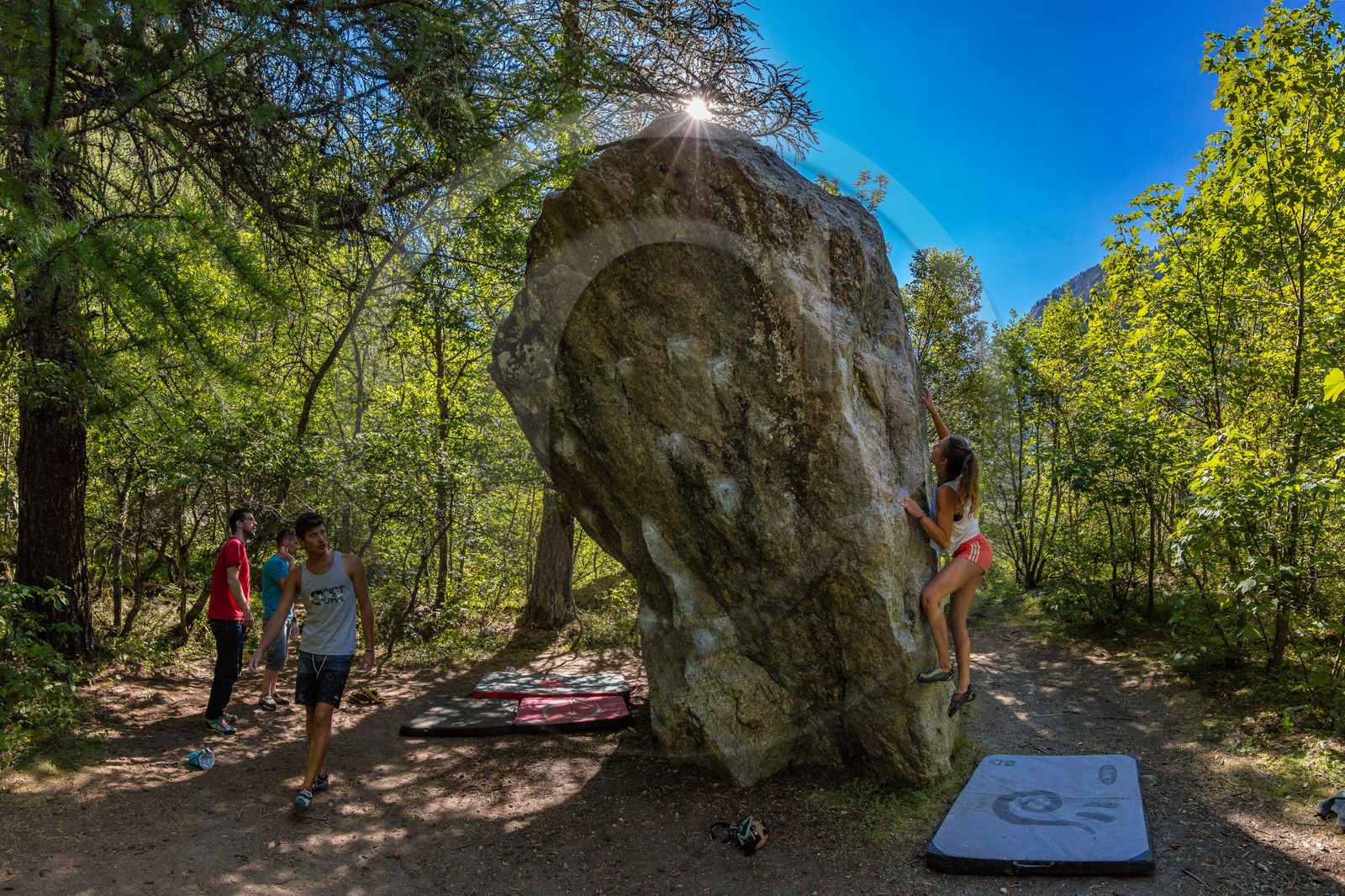 | Description | Hautes-Alpes (05), Pays des Ecrins, Parc national des Ecrins, Pelvoux-Vallouise, Ailefroide, site d'escalade de blocs, Emilie et Quentin sur "champignon" |