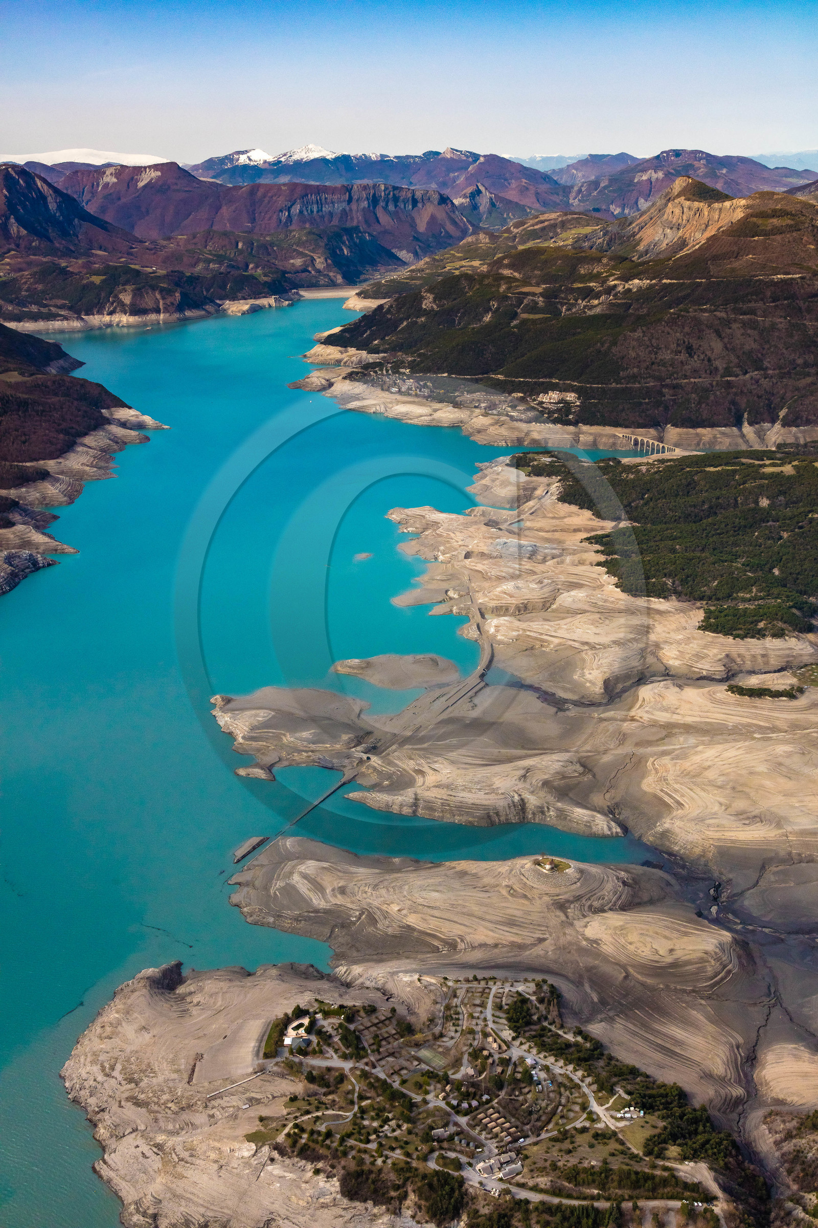 | Description | Hautes-Alpes (05), Pays de Serre-Ponçon, Barrage EDF, Lac de Serre-Ponçon, lLe niveau du lac est donné en mètres NGF 732 le 15 avril 2018 |