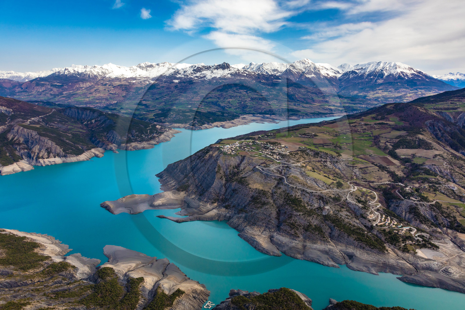 | Description | Hautes-Alpes (05), Pays de Serre-Ponçon, Barrage EDF, Lac de Serre-Ponçon, le niveau du lac est donné en mètres NGF 732 le 15 avril 2018 |
