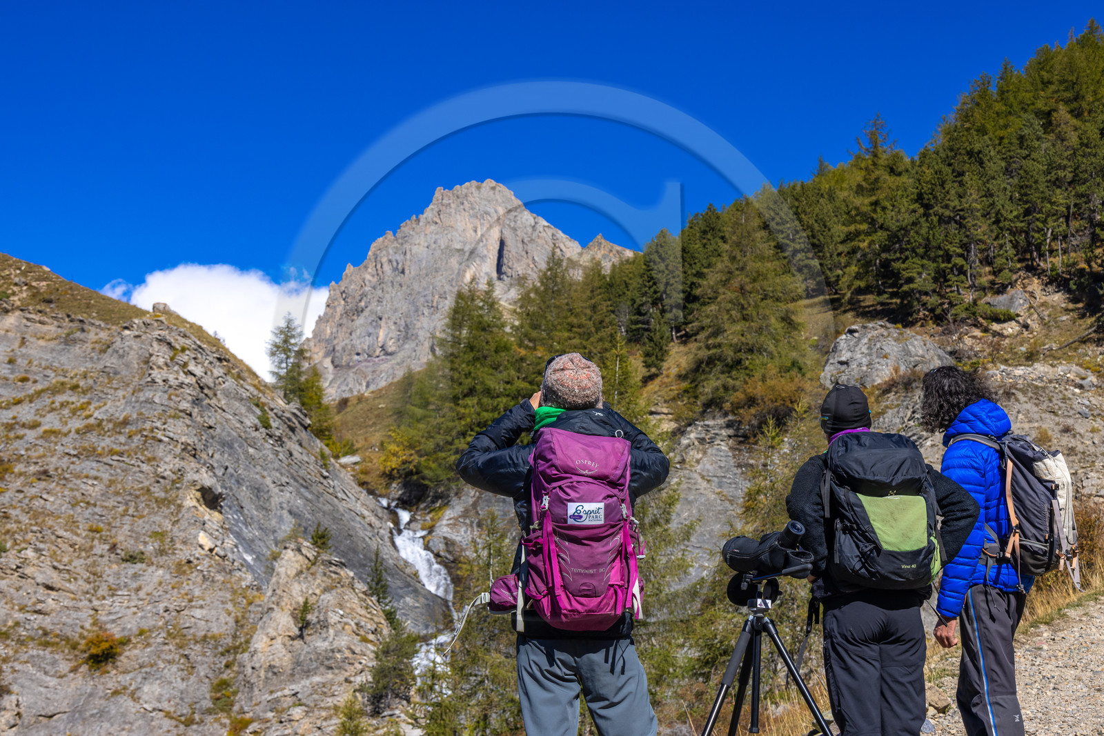 | Description | Hautes-Alpes (05), Parc national des Ecrins, Vallée de la Guisanne, Serre-Chevalier, Bureau Montagne Visa Trekking, randonnée pédestre avec Marjolaine Flammier, accompagnatrice en moyenne montagne, sortie découverte bouquetin Esprit Parc national |