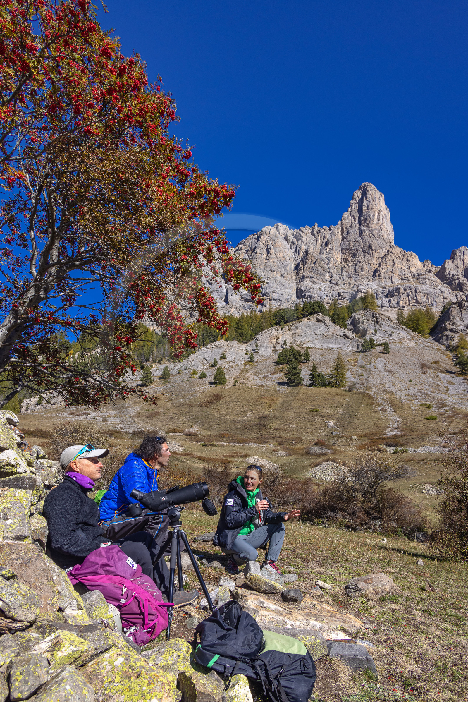 | Description | Hautes-Alpes (05), Parc national des Ecrins, Vallée de la Guisanne, Serre-Chevalier, Bureau Montagne Visa Trekking, randonnée pédestre avec Marjolaine Flammier, accompagnatrice en moyenne montagne, sortie découverte bouquetin Esprit Parc national |