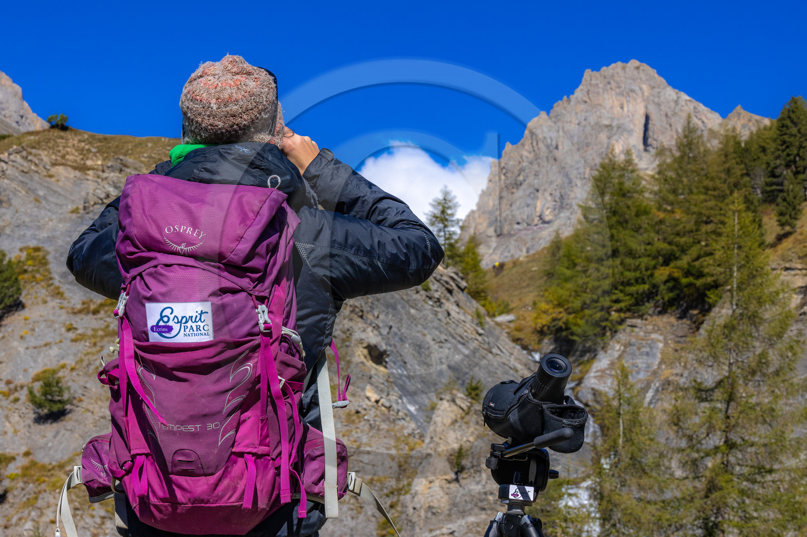 | Description | Hautes-Alpes (05), Parc national des Ecrins, Vallée de la Guisanne, Serre-Chevalier, Bureau Montagne Visa Trekking, randonnée pédestre avec Marjolaine Flammier, accompagnatrice en moyenne montagne, sortie découverte bouquetin Esprit Parc national |